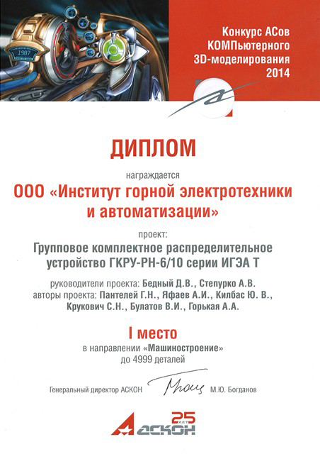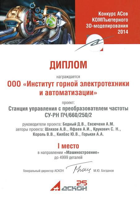 ООО «Институт горной электротехники и автоматизации» одержал победу в XII Конкурсе АСов КОМПьютерного 3D-моделирования сразу в двух категориях: