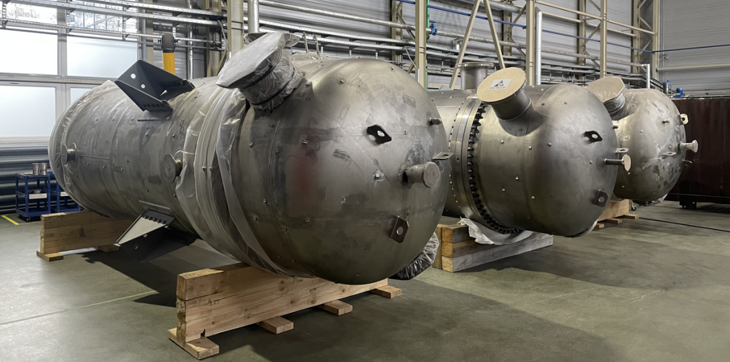 Далее оборудование будет упаковано и подготовлено к доставке на строительную площадку. Этот комплект оборудования будет осуществлять сбор, подогрев и подачу маточного раствора для селективного растворения KCl из сильвиновой руды. Поставляется с системой автоматизации и электротехническими решениями.